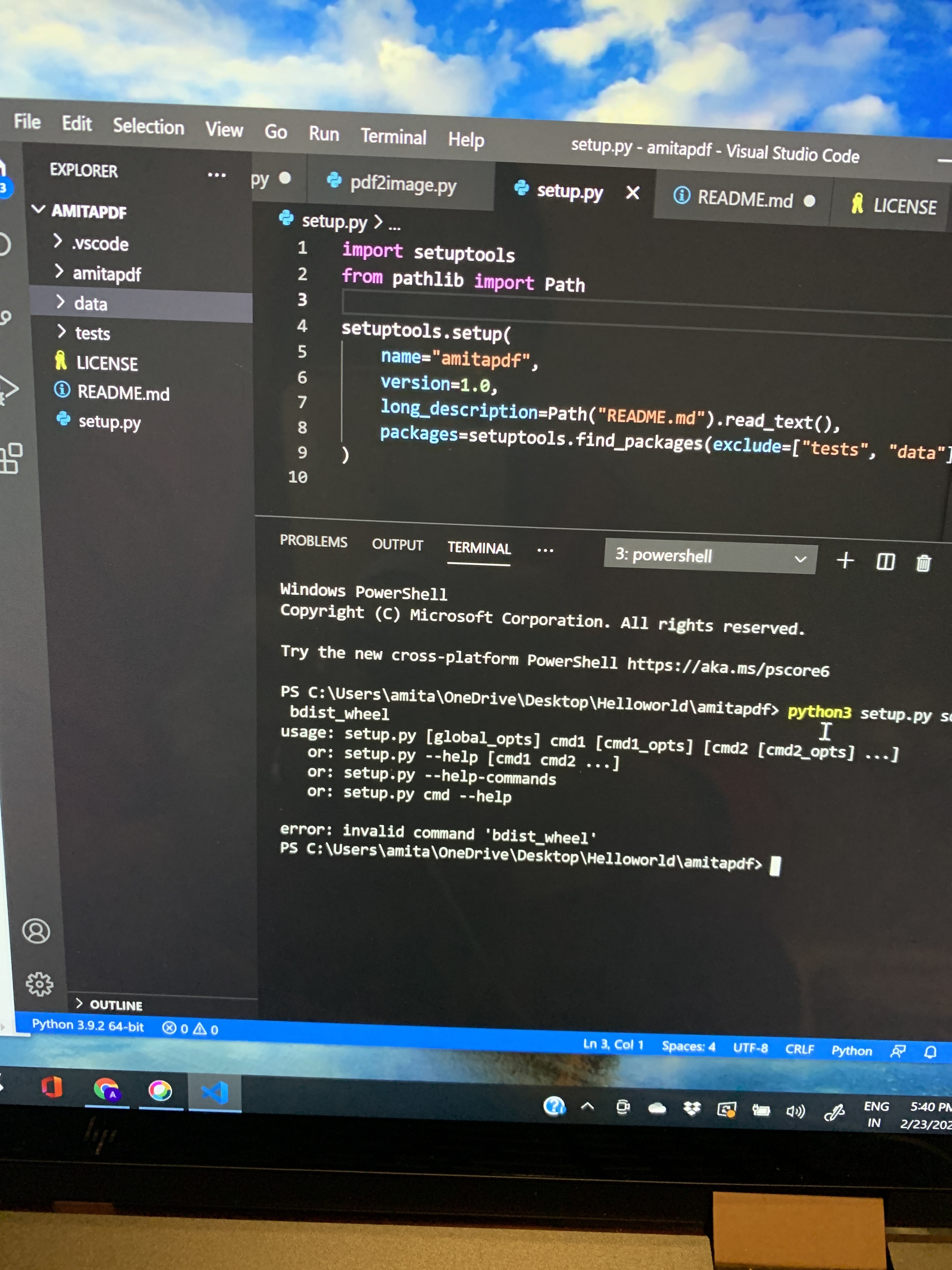 I am not able to generate distribution package in setup.py file. I have attached my error file. Please help me. I am doing python course and it’s from python package index Video no:8.