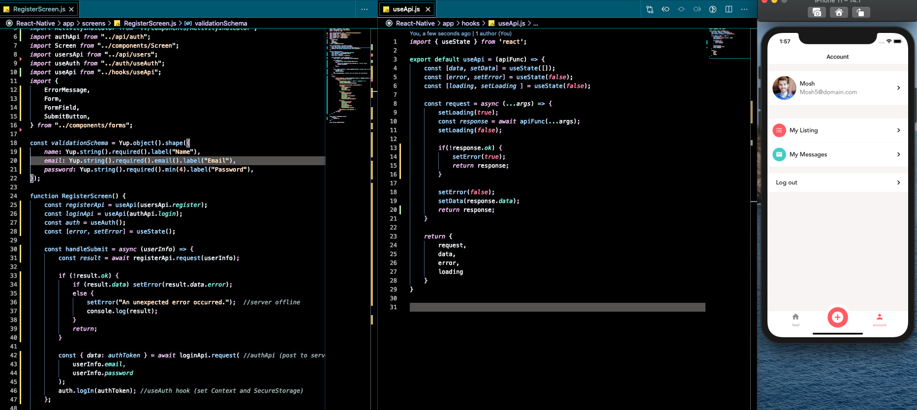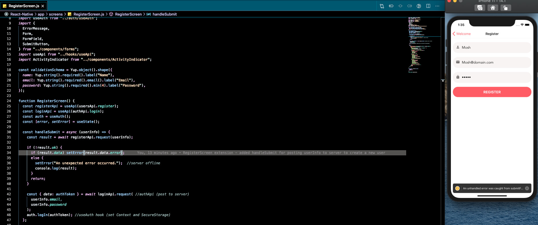 For some reason, my App is sending the data and receiving a response from the server. However, the error message is not being rendered on the RegisterScreen. When a new user is successfully created, nothing is happening on the UI.
